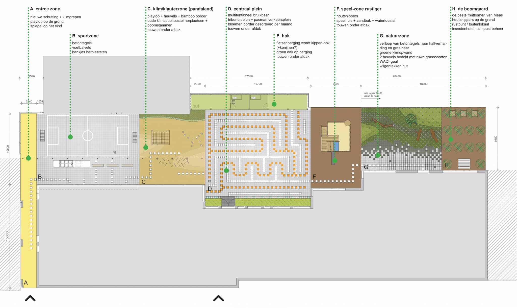 Speerpunt in het nieuwe plan is het toevoegen van groen en de differentiatie van (speel)gebieden. Het plein is in een aantal zones verdeeld om meer helderheid te geven in relatie tot de kartelige con­touren. Deze zones zijn functioneel verdeeld naar gelang de lichtinval en de aanwezige bebouwing. Er zit een verloop in van actief (sport) naar zeer rustig (fruitboomgaard), meer gericht op karakter dan leeftijd.
