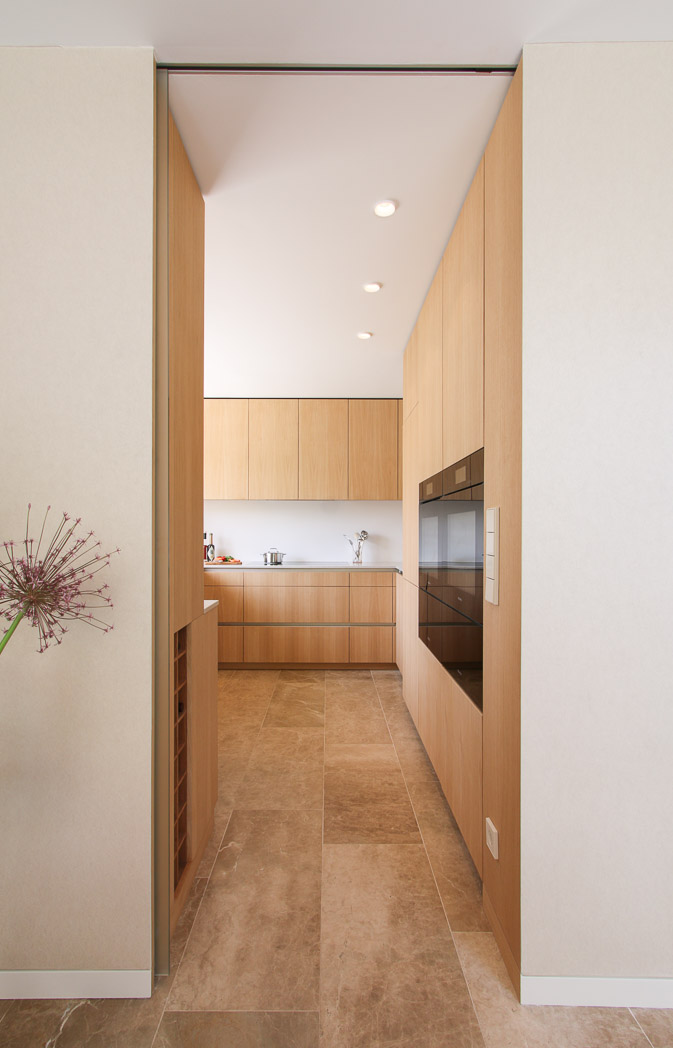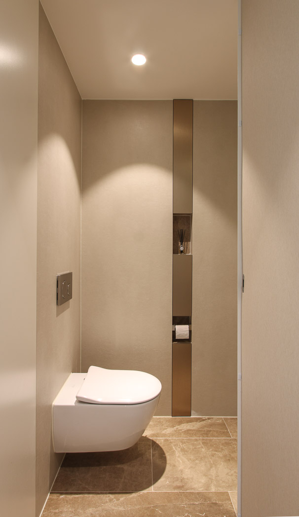 Zowel in het toilet als in de keuken is gebruik gemaakt van grote keramische platen met een stuc-structuur. Hierdoor zijn deze ruimten super goed te reinigen, zonder dat ze de uitstraling hebben van een betegelde ruimte.