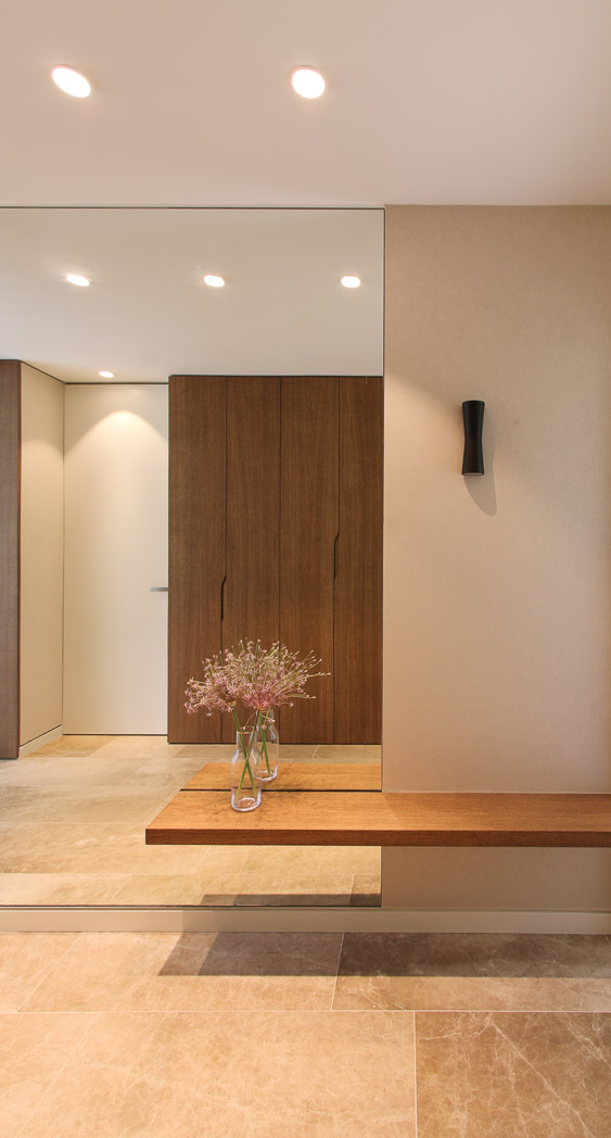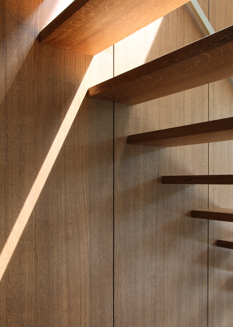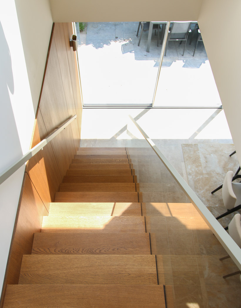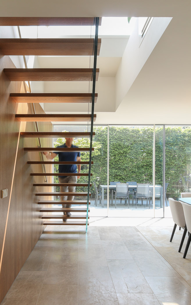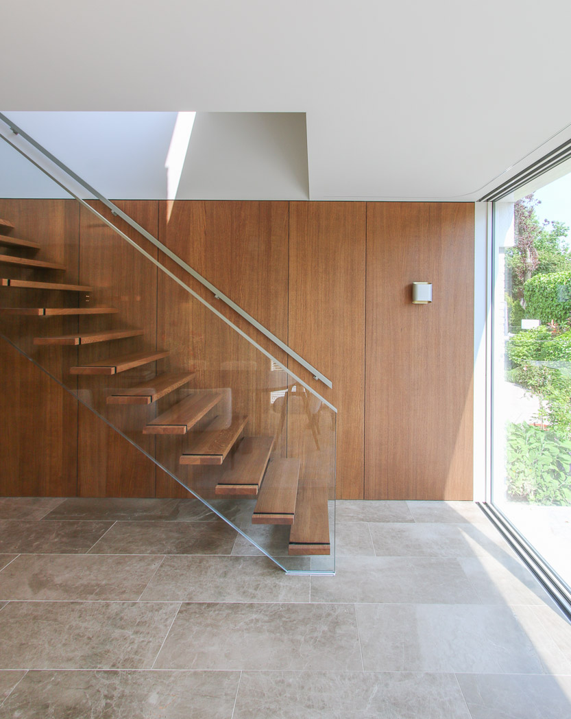 In deze villa in Osdorp hebben we een uitbouw gemaakt en de begane grond gerenoveerd. De uitbouw is voorzien van een SkyFrame pui, waarbij het kozijn geheel verdwijnt in de muren, de vloer en het plafond. Hiermee ontstaat er een sterke verbinding tussen binnen en buiten. De bewoners wensten een trap met een glazen balustrade. Daar komt enorm veel techniek bij kijken, die niet altijd even fraai is om te zien. We hebben daarom een detail bedacht waarbij de glasnoppen zijn weggewerkt achter houten opzetstukken. Hierdoor lijkt het alsof de traptreden door het glas heen steken en ligt de nadruk op de vorm en textuur in plaats van de techniek.
