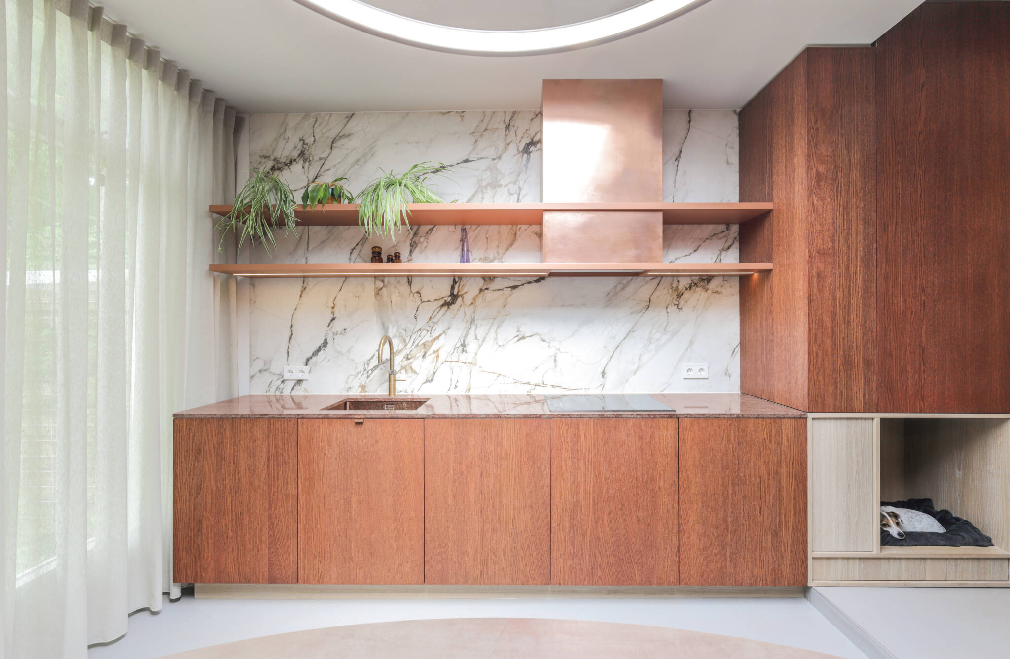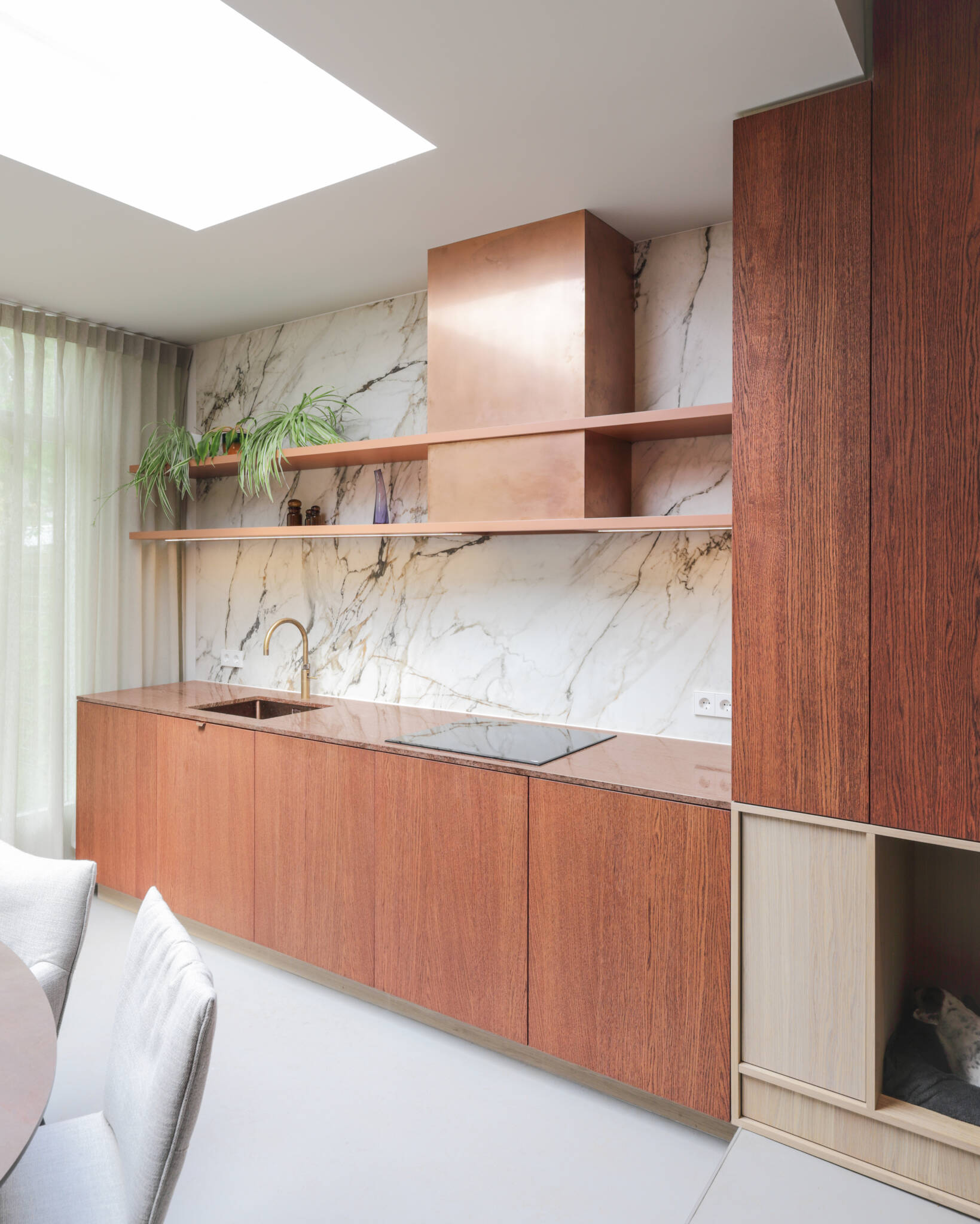 De kern van het materialen palet is het kersenrood geoliede eikenhout, waar zich verschillende tinten grijs en beige omheen hebben geschakeerd. De woonverdieping is behoorlijk expressief en de slaapvertrekken zijn veel rustiger qua toon.