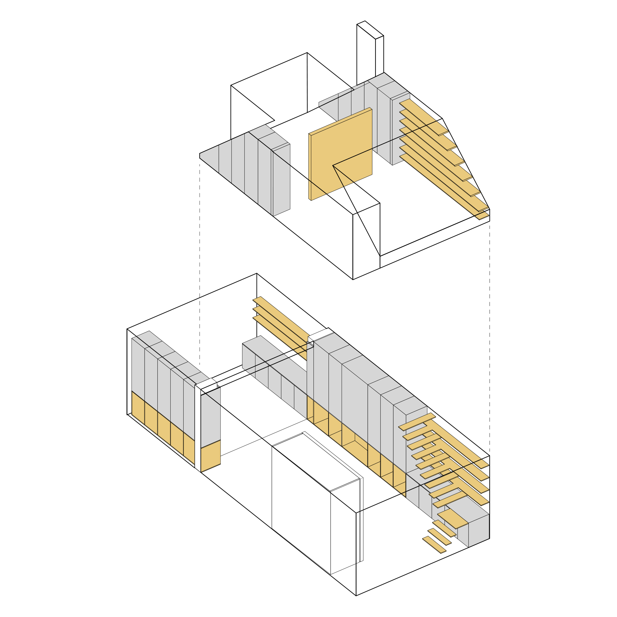 Naast het maken van een efficiëntere trapopgang hebben we ook een grote kastenwand ontworpen die over 2 verdiepingen loopt; kasten zijn nu eenmaal efficiënter dan een berghok, omdat er geen extra verkeersruimte wordt toegevoegd. Hierdoor was er op verdieping ruimte voor een kleine logeerkamer. De kast is zo ontworpen dat hij enerzijds de ruimten bij elkaar betrekt, maar anderzijds een duidelijke zonering in de woning accentueert.